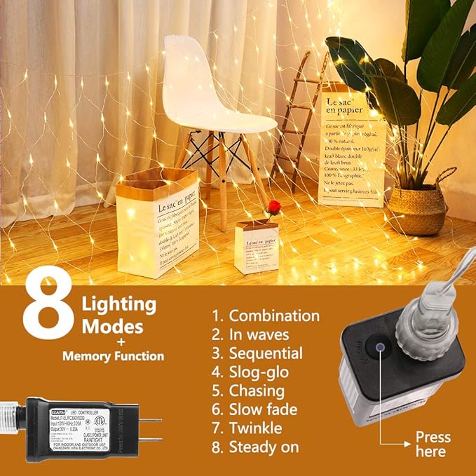 - 8 Modes & IP44 Waterproof: The led Christmas mesh lights come with 8 modes: Combination/ In waves/ Sequential/ Slo-Glo/ Chasing/ Slow fade/ Twinkle/ Steady on; and IP44 waterproof, you can choose your favor lighting mode for indoor & outdoor decoration. But Notice: ★ ★ Adapter is not waterproof, should be used with waterproof receptacle cover when used outdoor! ★★