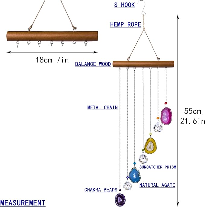 - Design - This crystal prism suncatcher is made of high quality K9 gradecrystal glass suncatcher prisms and beads,polished colorful agate rock slice,metal suncatcher chain,balance wood,hanging hemp rope and metal hook