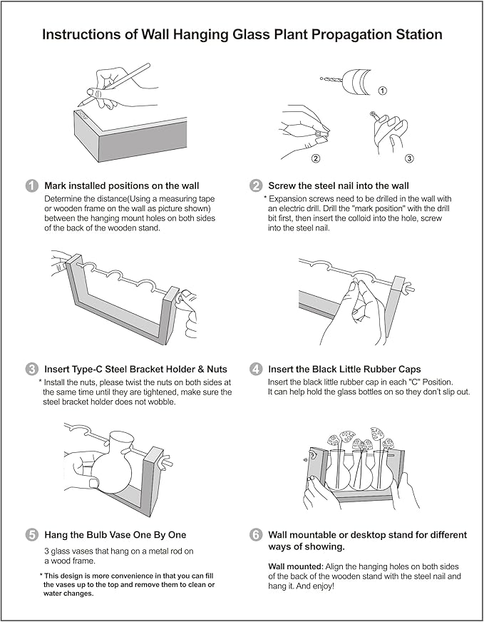- Easy to assemble: Run the rod into the wooden frame and screw on the fastener and tighten. Hang the glass bottle into the C-Type Holder. The little rubber caps can help hold the glass bottles on so they dont falling down. You can even mount it on the wall (wall mount and screws included). Dimensions: Wooden Frame is 11"L×2.17"W×4.9"H; Each Vase is 2.8"D x 4"H; Opening Diameter is 1.4". ****No plants or other decorative objects.