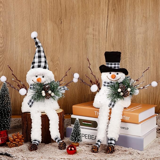 Lulu Home Christmas Snowman Decorations, Set of 2 Plush Shelf Sitters with Dangling Legs, Buffalo Checked Christmas Snowman Ornaments for Table Mantel Desk Fireplace Home Holiday Decor