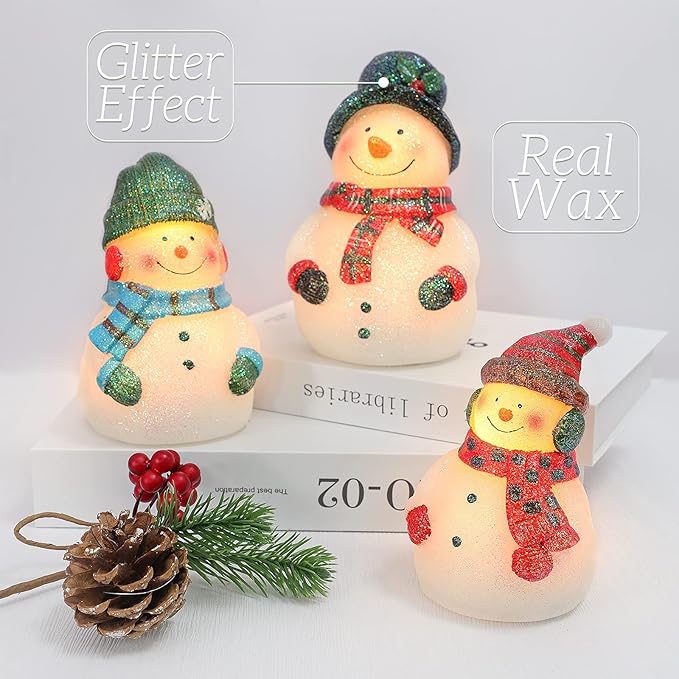 - 【Making A Cozier Atmosphere】 With fine sculpting technique & glittering sequins, these wax made snowman fake candles with colorful hats just like the real candles. Adding these charming snowman family candles set to your festive decorations. They will bring joy and happiness to your family for extra festive cheer.