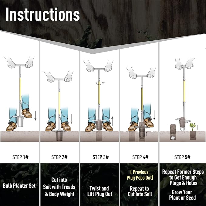 - 【3Pcs Bulb Planter Tools Set】- This bulb planting set comes with long handle bulb planter, small bulb planter with depth mark and dirt-proof gardening gloves. Step and twist to pull out plugs, quickly make rows of consistant holes in 3" dia for your bulbs