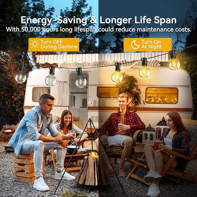 - Energy-saving & Longer Life Span: String Lights For Outside Reduce Your Electricity Bills And Save Energy. The Led Bulbs Last 20 Times Longer Than Tungsten Glass Bulb. With 50,000 Hours Lifespan Could Reduce Maintenance Costs On Changing Bulbs Frequently