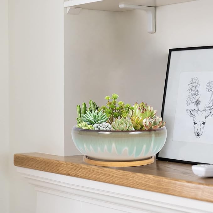 SQOWL 7 Inch Ceramic Succulent Planter Pot with Drainage Hole Drip Glazed Binsai Pot with Bamboo Tray for Indoor Plants