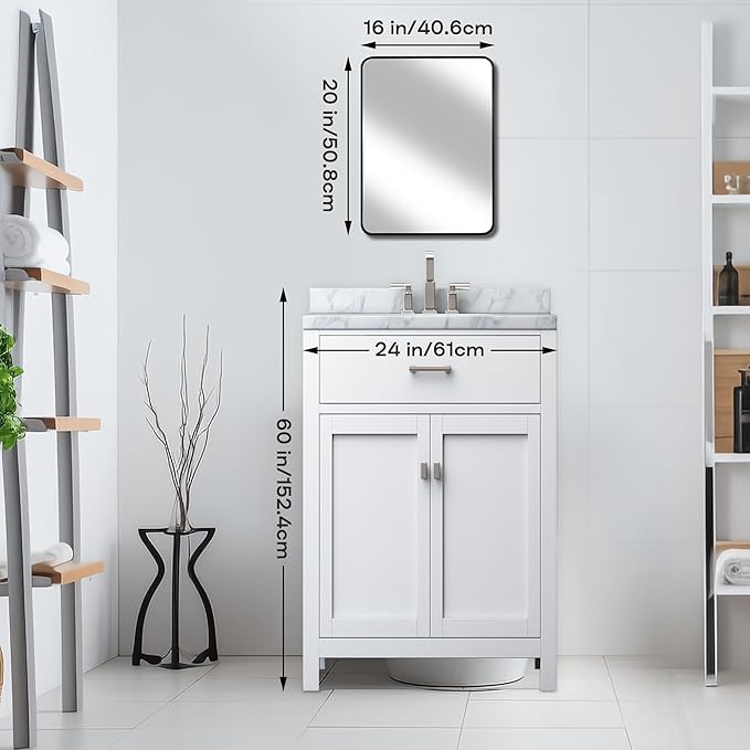 Wall Mount Mirror for Bathroom, Brush Black Metal Framed Rounded Corner Rectangular Vanity Mirror (16" x 20", Black)