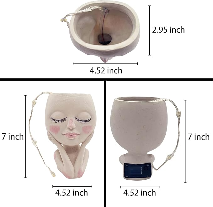 - đźăFace Flower Pot with Solar Light Stringă- The unique face flower pot combines the solar waterproof LED light string, which is charged by sunlight during the day, and when the night comes, the light string will automatically light up, and the glowing "hair" plants look energetic