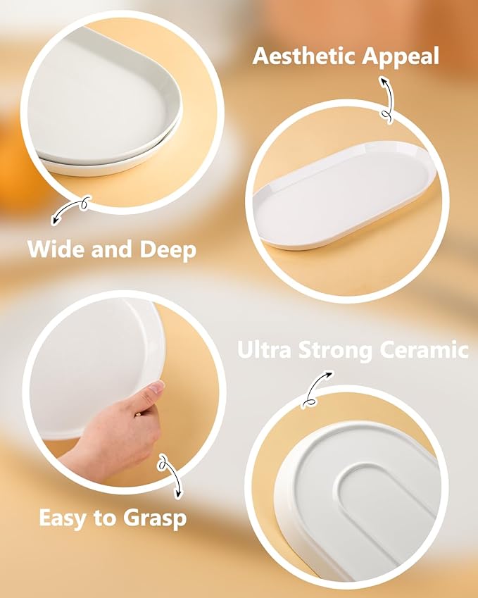 - UNIQUE OVAL SERVING PLATTERS - Graceful line oval platter crafted in creamy white porcelain has a deep rim and wide design, Rounded edges makes it more convenient to carry and serving. Compared to traditional rectangle platters, is more creative and create a Impressive dining experience.