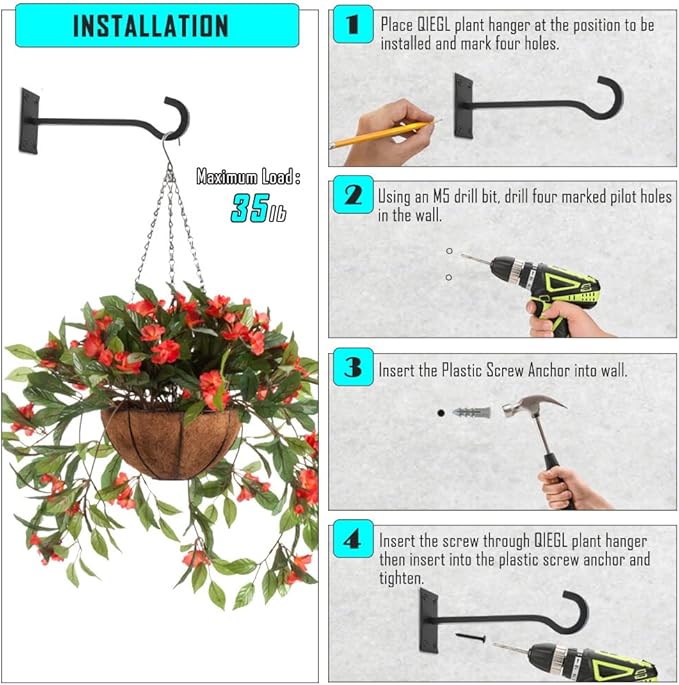 - 【HEAVY DUTY】The heavy-duty plant hanger is 10 inches long, hook thickness 0.45 inch and wall plate thickness 0.18 inch. It is Made of 100% solid cold-rolled steel, strong and durable with good toughness. the wall-mounted hanger can bear up to 35 pounds, and can hang heavier flowerpots and decorations.