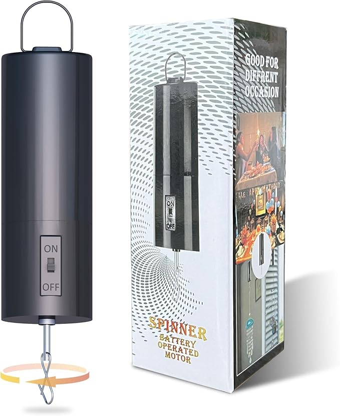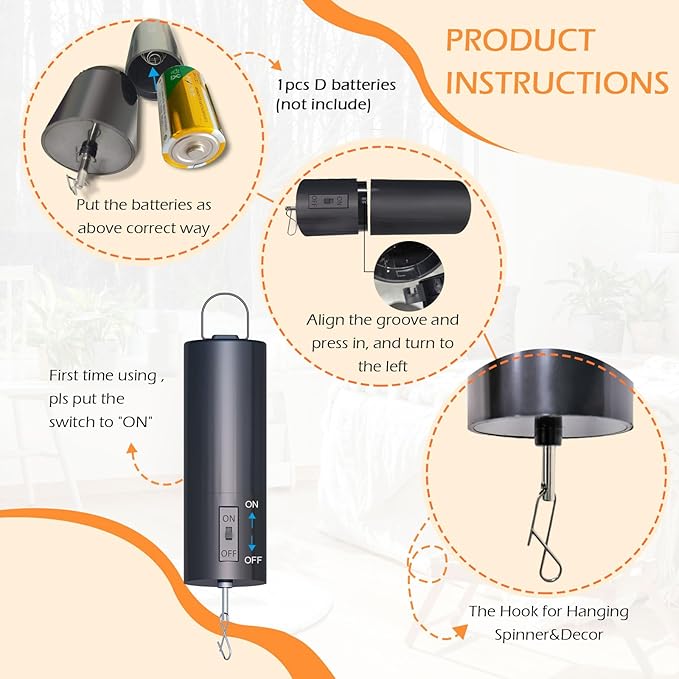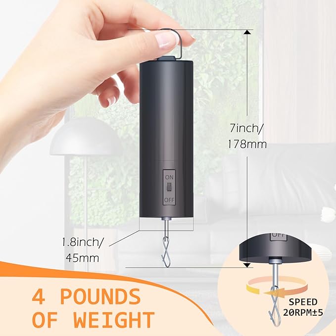 - 【Compact size】5.11in long ,1.69in diameter;Light weight:0.14 kg,Compact size with exquisite structure,easily to hang up to save place.Medium Revolving speed,approximately 30+/-5 RPM depending on battery power and item weight,the rotating speed of this small ornament motor can perfectly spin your hanging decor to show the cool reflective visual effect.