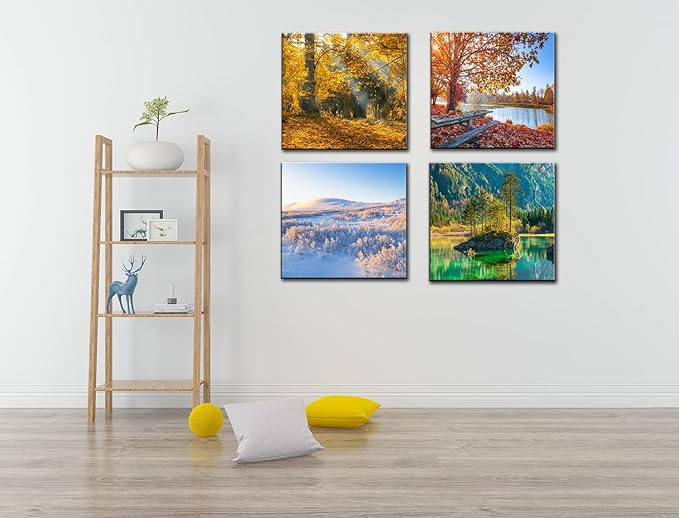 OKEXCKK Four Seasons Landscape Canvas Wall Art Decor - Spring Summer Autumn Winter Colorful Tree Painting Modern Nature Forest Prints Artwork Picture for Bathroom Office Decoration 16"x16"x4 Panels