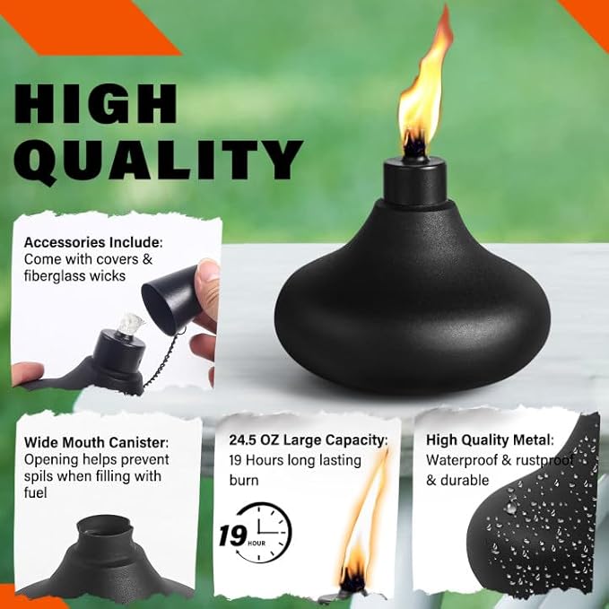 - ✿High Quality Metal Table Top Torches: Our Metal Table Top Torches made of premium metal. durable and lightweight. Each tabletop torches hold approximately 24.5 oz of fuel, allowing the burning time more than 19 hours .