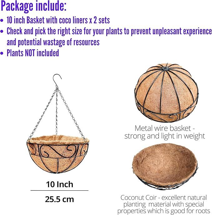 - 2-PACK SET: 10 Inch, medium size. Pick the right size for your plants to prevent unpleasant experience and potential wastage on resources. Flowers and Plants are NOT included. These metal hanging planters are ready to hang with hanging chain and hook. Assembly not required