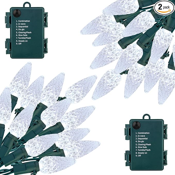 - 【 8 Lighting Modes 】- There are 8 different modes for the C6 Christmas string lights, including waves, sequential, slow glow, flashing, slow fade, twinkle, and combination, as well as standard on and off. It can be controlled by pressing the button on the battery box. Ideal for your everyday decor as well as holiday decoration.