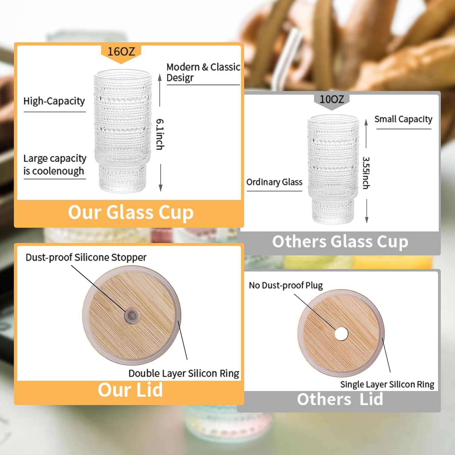 - 【Hobnail Water Cups】---These retro and vintage beaded style embossed drinking glasses with fashioned are so classy and pretty, ; These hobnail glassware are the eye catching addition to kitchen home decor,and the highball drinking glasses are about 16 oz in capacity and about 6.1 inch/ 15.5 cm in height.