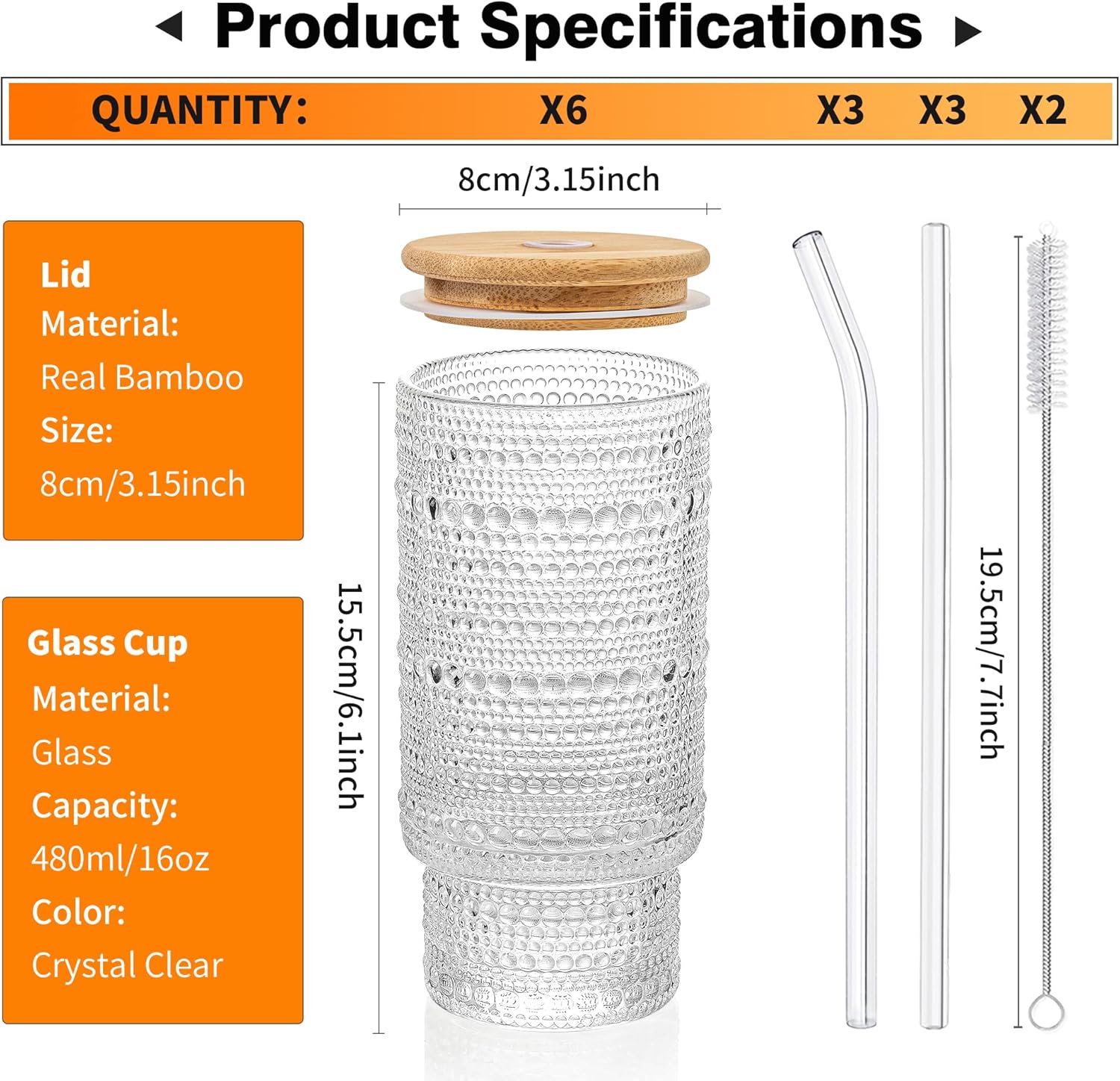 - 【Package List】--- Includes 6 x Large juice Glasses, 6 x Reusable Straw, 6 x Bamboo lid , 2 x Straw Brush. High quality glass, smooth yet durable, comfortable to pick up and hold. Crystal clear glasses, any drinks looks nice inside and make a good ins photo.