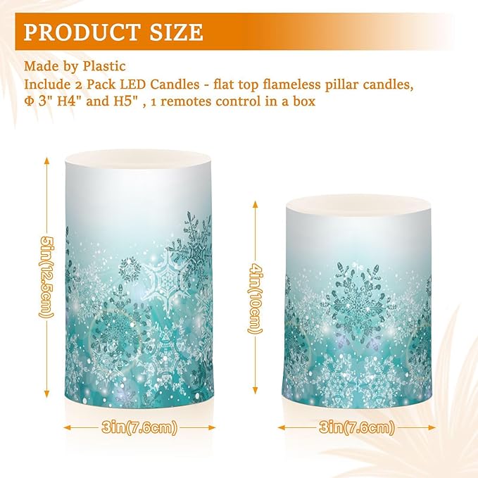 Silver Winter Teal Turquoise Snowflakes Christmas Flickering Flameless Candles Battery Operated with Remote Timer,Tea Light Candles LED Pillar Votive Candles set of 2 for Outdoor Indoor Decorations