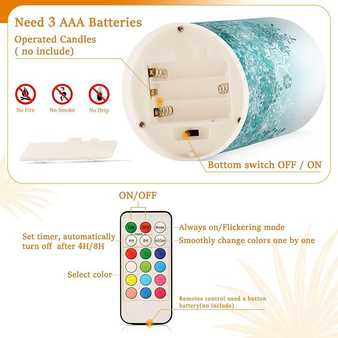 - Convenient Operation: Remote control candles allows you to set timer on your pillar flameless candles automatically turn on or off, also can adjust different flash mode lights according to your preferences, battery operated candle uses 3 AAA batteries, and the remote control uses 3V electronic buttons(Batteries are not included in this package)