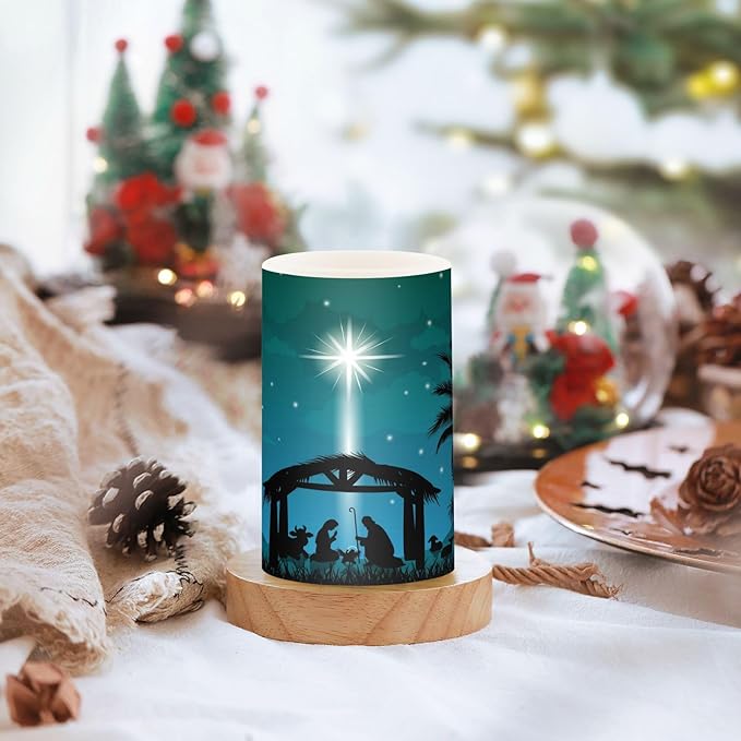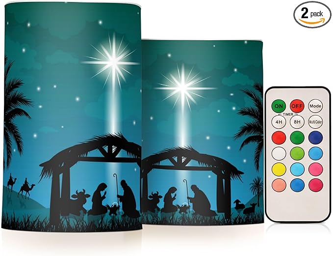 ALAZA Christmas Scene of The Nativity Flickering Flameless Candles Battery Operated with Remote Timer,Tea Light Candles LED Pillar Votive Candles Set of 2 for Outdoor Indoor Decorations