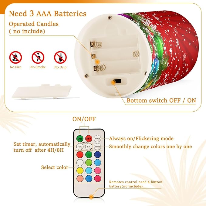 - Convenient Operation: Remote control candles allows you to set timer on your pillar flameless candles automatically turn on or off, also can adjust different flash mode lights according to your preferences, battery operated candle uses 3 AAA batteries, and the remote control uses 3V electronic buttons(Batteries are not included in this package)