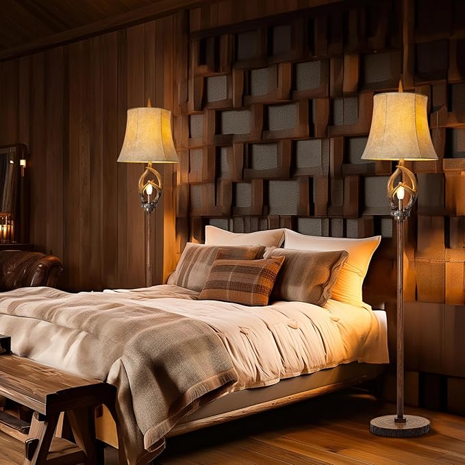 Scenekoy Rustic Farmhouse Antlers Floor Lamp with Night Light Faux Leather Bell Shade Brown Finish Tall Industrial Tall Standing Lamp Decor for Living Room Bedroom Hotel Office (Bulb Included)
