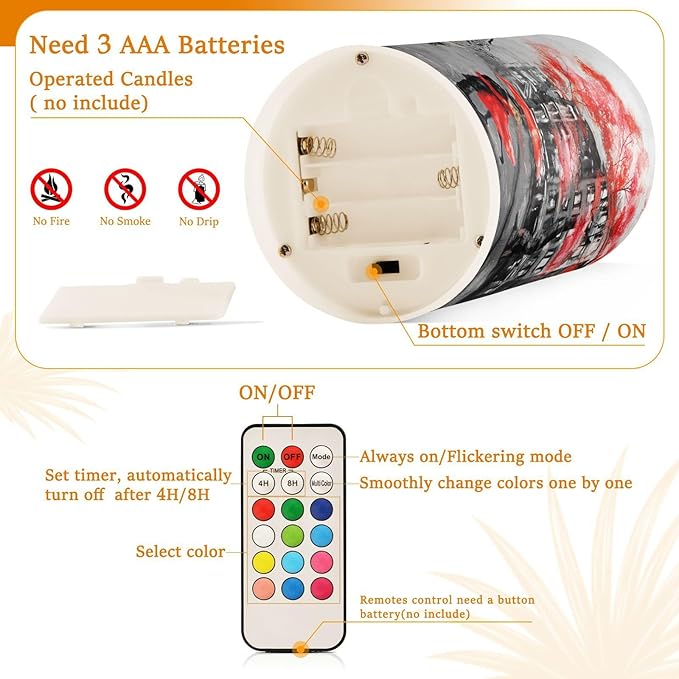 - Convenient Operation: Remote control candles allows you to set timer on your pillar flameless candles automatically turn on or off, also can adjust different flash mode lights according to your preferences, battery operated candle uses 3 AAA batteries, and the remote control uses 3V electronic buttons(Batteries are not included in this package)