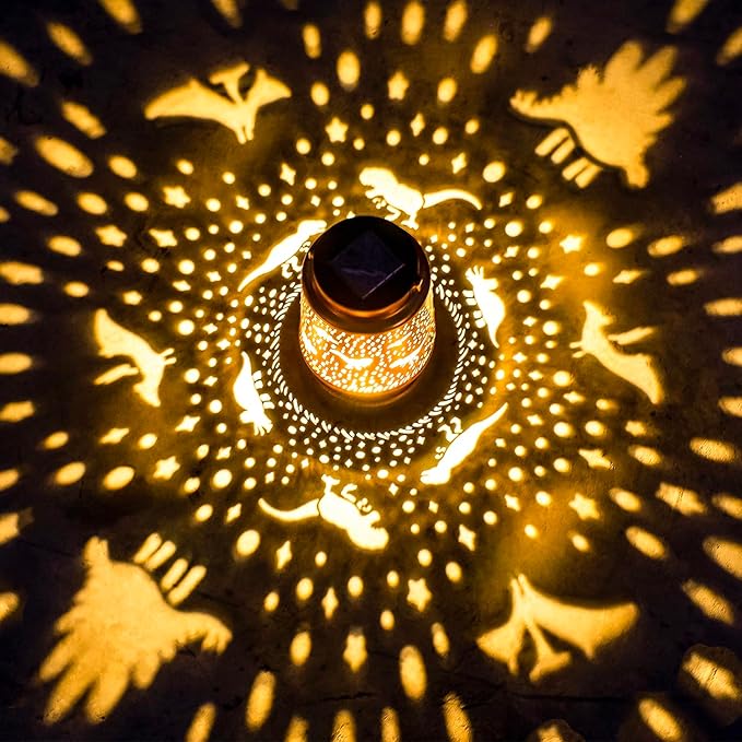 - 【Unique Garden Decor】Dinosaur solar lantern can project unique and beautiful patterns in a dim environment,creating a gorgeous and warm atmosphere to bring life and fun to your garden and attract your family or friends.The unique hollow out design and beautiful antique bronze color give it an artistic touch,perfect for decorating gardens,backyards,corners,Outside,sidewalks and many other scenes.