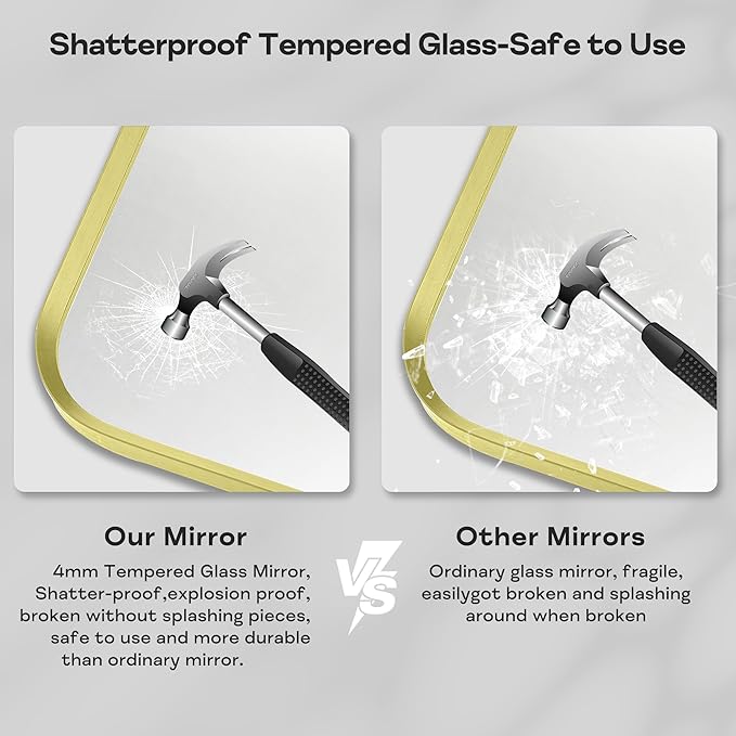- Exceptional Quality: Our gold bathroom vanity mirror is made of 4MM tempered glass, more shatterproof and explosion-proof than ordinary mirrors, making it safer to use. The frame is made of advanced aluminum alloy frame, which is waterproof and rust proof, sturdy