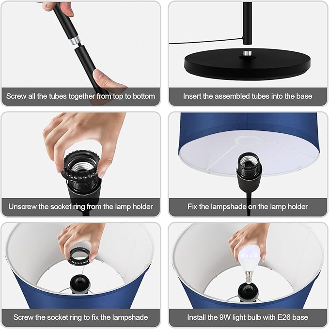 - 【Easy Assembly and premium quality】Made with black metal body and blue linen lampshade, the standing floor lamp is simply designed and look good in any surroundings; With the 6lb sturdy base, this 58-inch (5ft) tall lamp stands steadily and won't tip over easily, which is safe for kids; Without tools required, you just need to screw all the parts together to finish the assembly of this standing lamp; PS. The assembly video is attached to the product page