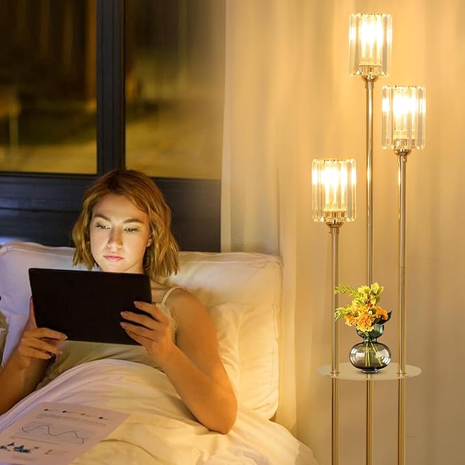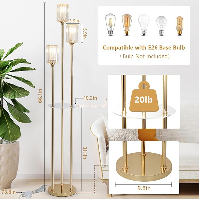 - 【Charming Crystal Lampshade】This gold floor lamp uses premium K9 crystal lampshade, the dazzling look brings a sense of class and elegance to your home. The stepped structure design of the modern floor lamp with crystal shade is mesmerizing and also brings 360° lighting. Compared with fabric or glass shade, crystal floor lamp is undoubtedly more stylish and bright. The floor lamp with shelves will be a stunning glimpse in the corner of your living room bedroom.
