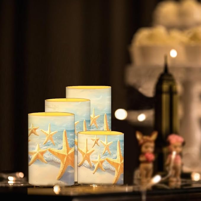 Flameless Candles Battery Powered LED Candle with Remote Timer Color Changing Control Set of 4 for Indoor Outdoor Beach Wedding Home Decoration, Coastal Gold Starfish