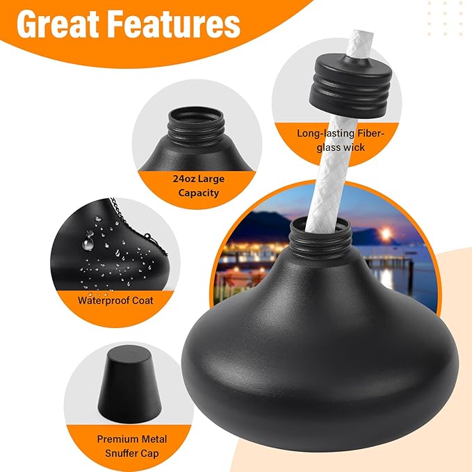 - 💝Large Capacity: Each tabletop torches hold approximately 24 oz of fuel, allowing the burning time more than 10 hours. Recommended using a funnel when filling torches with oil. It is easily available in the market. Please use snuffer to put out flame and protect the wick after use.(Note: These torches do not contain fuel)