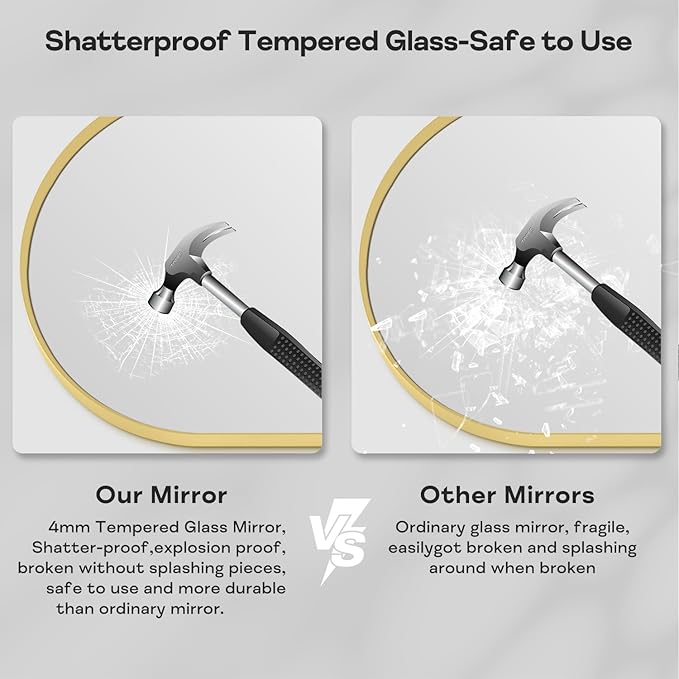 - High-Definition mirror: The gold bathroom vanity mirror adopts high-definition imaging technology, which is as clear as crystal, ensuring that the imaging at all angles and distances will not be deformed and blurred, showing its true beauty. And the arched bathroom mirror uses 4MM Tempered Glass, can effectively prevent damage during transportation