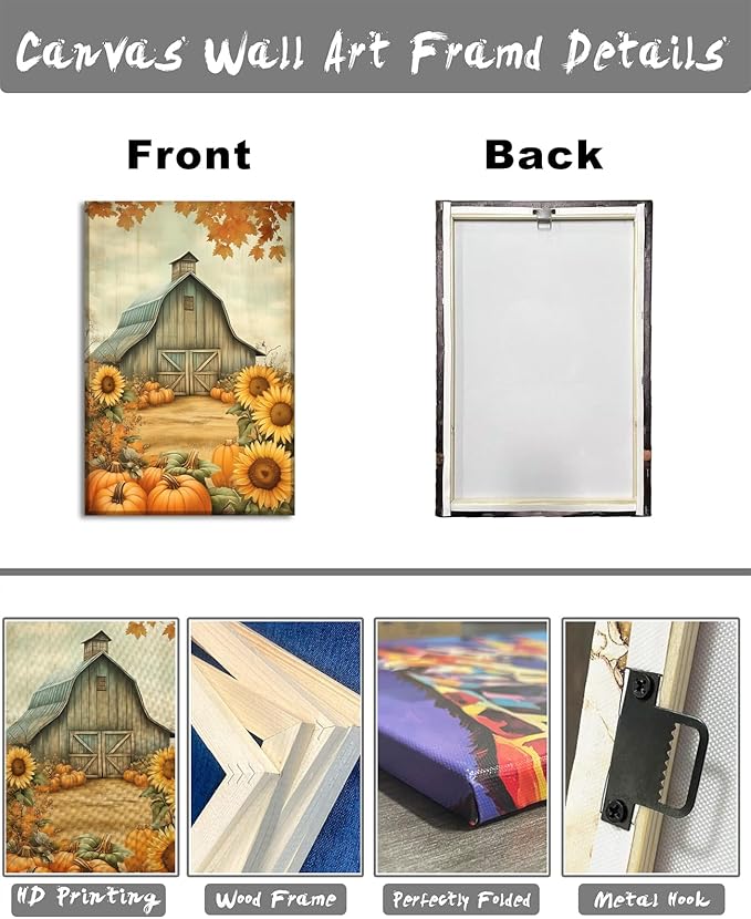 LYUNSHUO Canvas Wall Art Pumpkin Wall Decor Rustic Farmhouse Picture Old Barn Painting Sunflower Poster Autumn Harvest Vintage Artwork for Home Decor Frame - 12"x18"