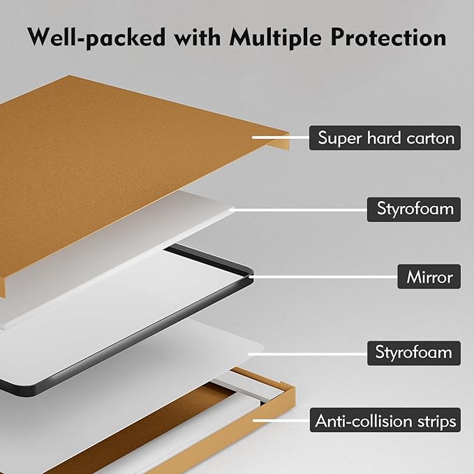 - Safety Packaging: The mirror is wrapped by professional packers using customized thick foam all around, passed strict drop and impact tests to make sure you receive the perfect mirror