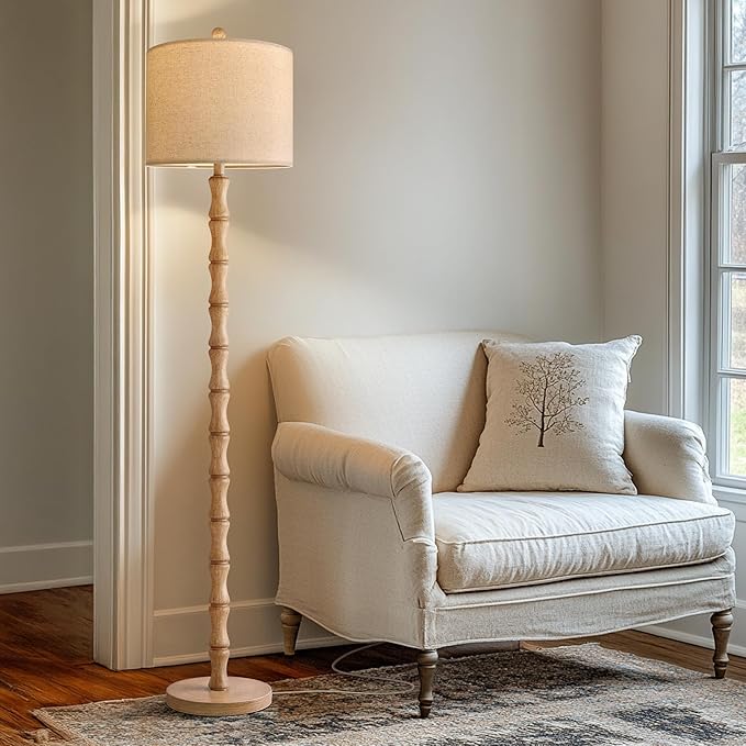 - 【Retro and elegant design】: Bring a warm ambiance to your home with this natural wood color floor lamp, featuring unique knobby details that add an elegant sence to your decor. The linen shade diffuses light softly, creating a cozy and comfortable atmosphere.