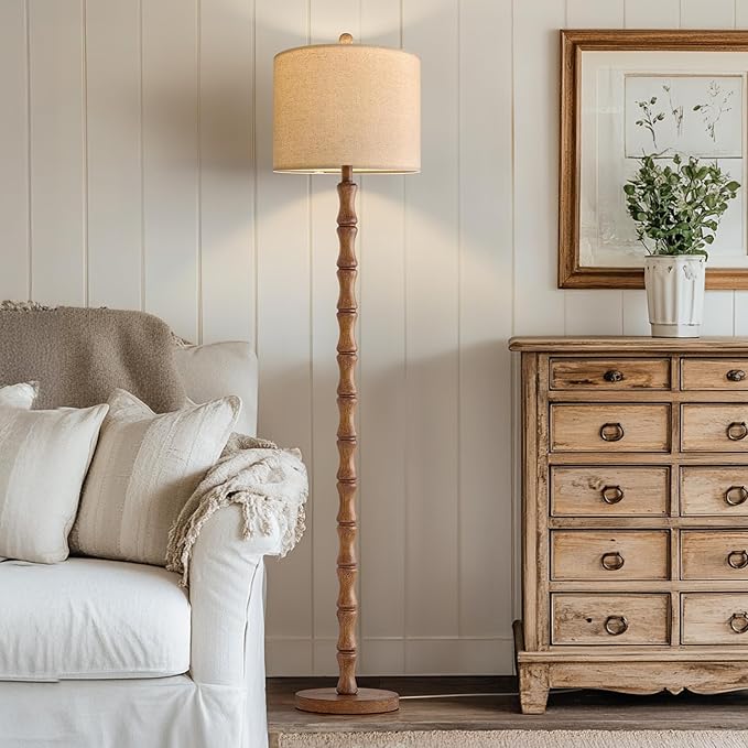 - 【Retro and elegant design】: Bring a warm ambiance to your home with this Light Walnut color floor lamp, featuring unique knobby details that add an elegant sence to your decor. The linen shade diffuses light softly, creating a cozy and comfortable atmosphere.