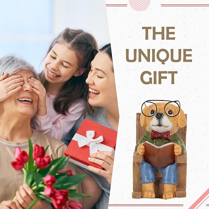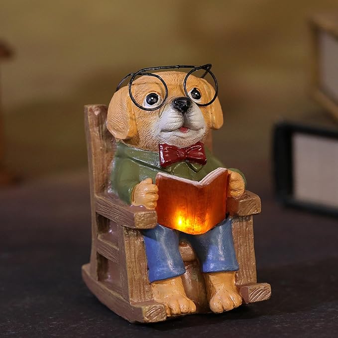 - Perfect Solar Dog Christmas Decoration - This charm dog statues outdoor solar lights, reading a book on a cozy rocking chair, cute and creative, add more warmth atmosphere to your home, win your neighbors' attention at Christmas. Christmas dog ornaments lifelike detail and relaxed pose make it a delightful addition for dog lovers and book lovers alike.