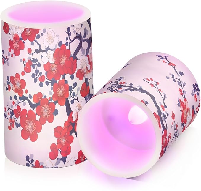 ALAZA Chinese Art Cherry Blossom Flickering Flameless Candles Battery Operated with Remote Timer,Tea Light Candles LED Pillar Votive Candles Set of 2 for Outdoor Indoor Decorations