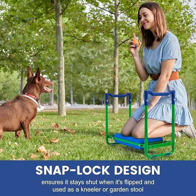 - Foldable Seat – garden kneelers for seniors is portable and easy to take, you just need three steps to fold gardening bench kneeler and seat for seniors, you can see that in our pictures. Put the used stool on a flat surface and remove the cloth bag, then press the spring tightly and lower the foot of the kneeling bench for gardening.