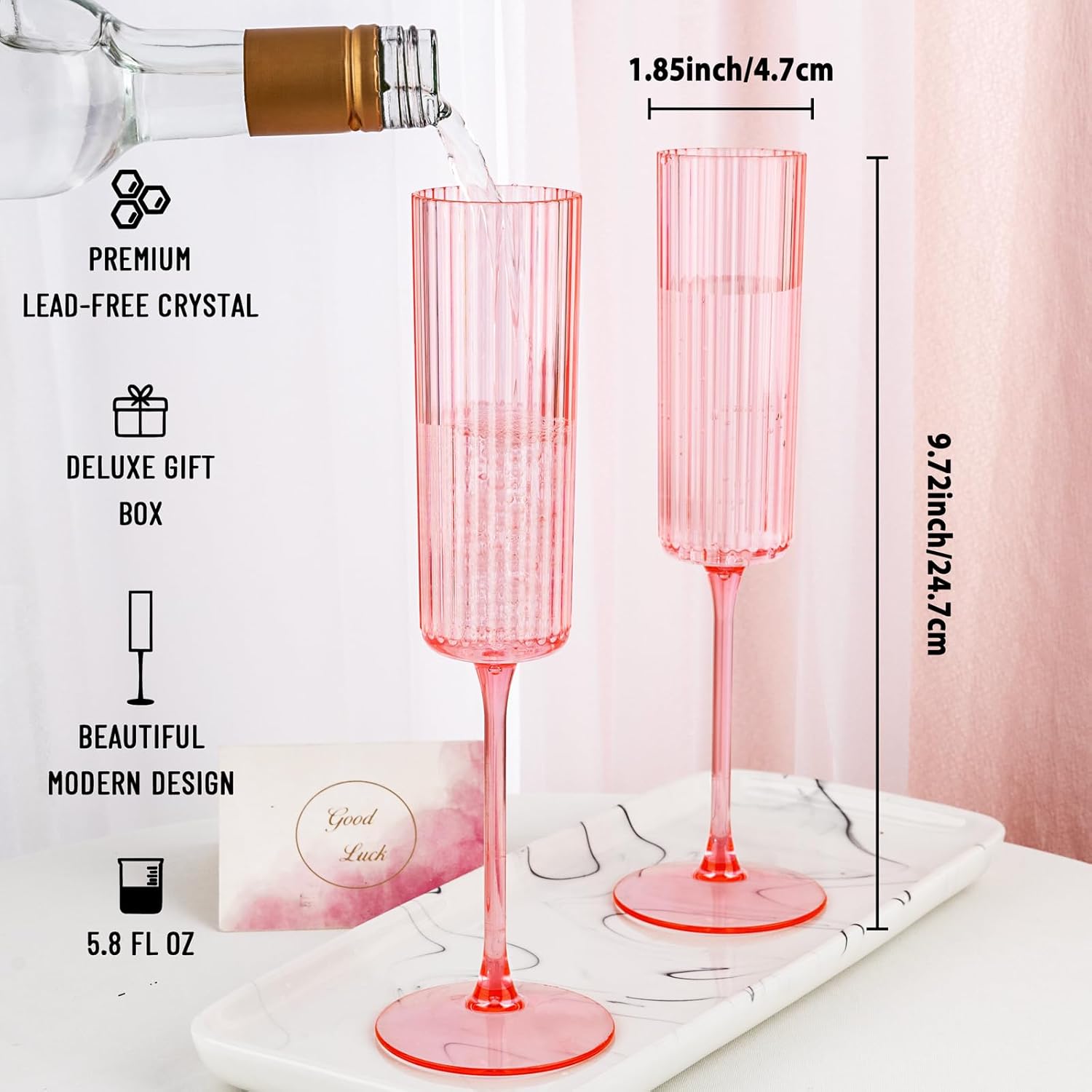 - 24-Pack Set with Great Value: Each set of plastic champagne flutes contains 24 exquisite ribbed champagne plastic glasses, with a capacity of 6 ounces per flute. Whether you're hosting a grand social gathering, a romantic wedding celebration, or a joyous holiday party, these pink plastic champagne glasses can fully meet your needs and provide you with a cost-effective party supplies solution.