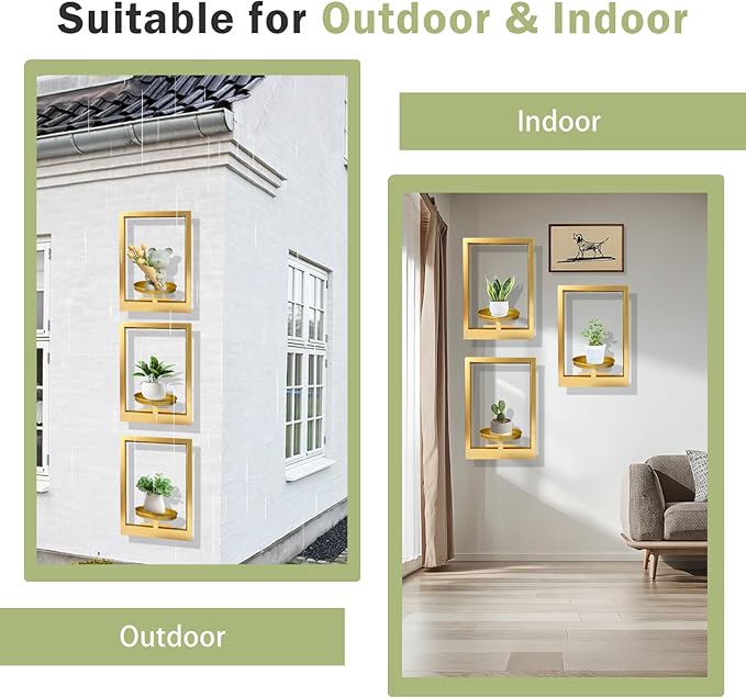 Picture Frame Plant Holder, Wall Mount Plants shelf Indoor Outdoor, Metal Hanging Planters Stand Decor, Window Planter Hanger Shelves, Modern Floating Ornament Rack Art for Home & Garden(Gold 3pc)