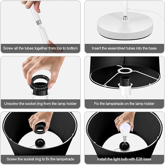 - 【Easy Assembly & Premium Quality】Made with white metal body and black linen lampshade, the boho floor lamp is simply designed and look good in any surroundings; With the 6lb sturdy base, this 59-inch (5ft) tall lamp stands steadily and won't tip over easily, which is safe for kids; Without tools required, you just need to screw all the parts together to finish the assembly of this standing lamp; PS. The assembly video is attached to the product page