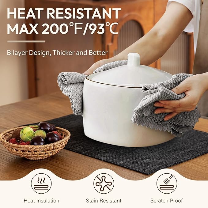 - Perfect Protection - Crafted from DUAL-LAYER faux linen, these placemats safeguard tables against 200°F heat, scratches and fading with a naturally textured surface. The dense weave stays wrinkle-free, while ECO-FRIENDLY material ensures every use protects both your tableware and the planet