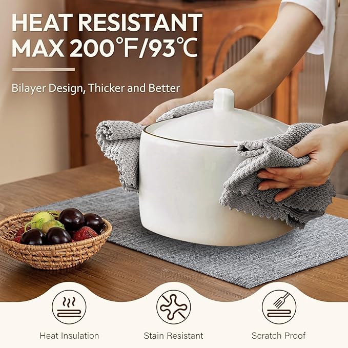 - Perfect Protection - Crafted from DUAL-LAYER faux linen, these placemats safeguard tables against 200°F heat, scratches and fading with a naturally textured surface. The dense weave stays wrinkle-free, while ECO-FRIENDLY material ensures every use protects both your tableware and the planet