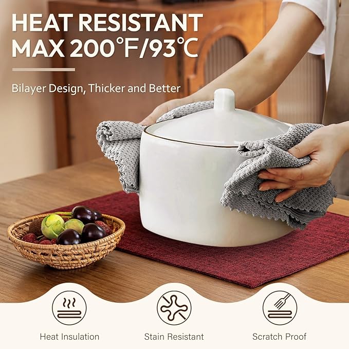 - Perfect Protection - Crafted from DUAL-LAYER faux linen, these placemats safeguard tables against 200°F heat, scratches and fading with a naturally textured surface. The dense weave stays wrinkle-free, while ECO-FRIENDLY material ensures every use protects both your tableware and the planet