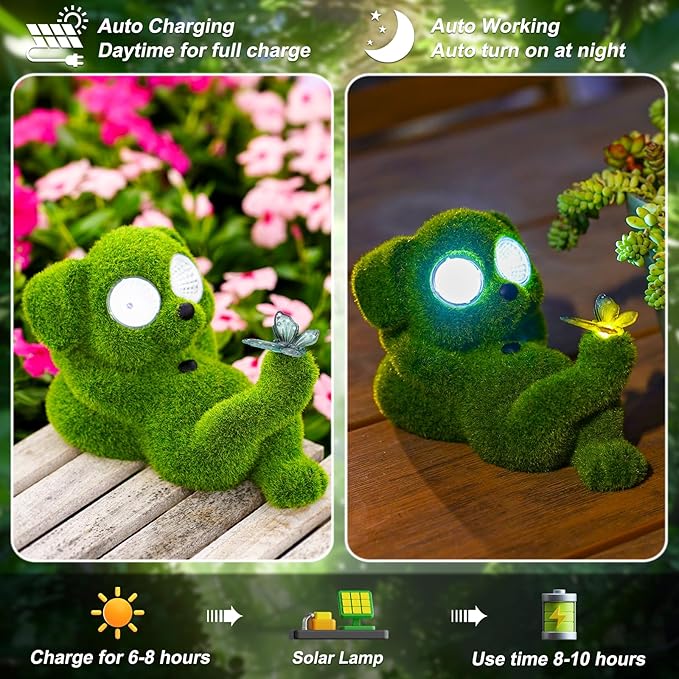 - 【Easy to Use】This dog garden statue features built-in solar lights. Please press the button on the back of the dog statue before use. Then place the product in direct sunlight for optimal charging. It charges during the daytime and automatically lights up at night. The LED lights will fully charge within 6-8 hours and light up for 8-10 hours.
