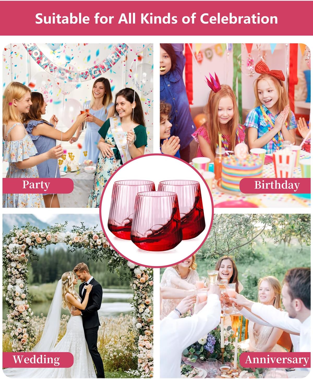 - Premium Quality Pink Plastic:Made from premium quality pink plastic, these plastic stemless wine glasses are durable and less likely to break than glass alternatives, making them ideal for outdoor gatherings and family events. The pink plastic wine cups clear material enhances the visual appeal by showcasing the color and layers of your drinks, giving them a sophisticated touch, while still being practical and lightweight for casual or formal occasions.