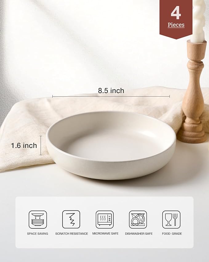 - PASTA BOWL SET OF 4: Ideal size 8.5’’ Dia, practical depth 1.6’’ H, It holds contents both solid & liquid with ease- great for pasta, soup, dessert, ice cream, rice, beans and so on