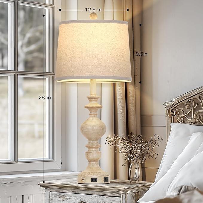 28" Farmhouse Table Lamps Set of 2, Rustic Lamp for Living Room with USB C+A Ports & AC Outlet, 3 Way Touch Control Resin Bedside Lamps, Retro Bedroom Lamp for Nightstand Side End Table Desk, Beige