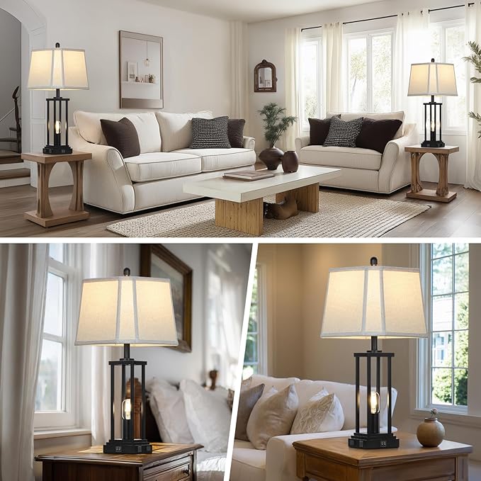 - Farmhouse Table Lamps Set of 2: This black living room table lamp is made of high quality alloy with a baked finish. The unique square sturdy frame complements the linen bell shades. Not only illuminate your home, but are a artwork that adding industrial and rustic atmosphere to the room and upgrading the overall style. This industrial table lamp's elegant tones and frame make it a versatile decoration suitable for a bedroom, office, foyer or living room